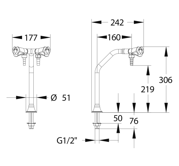 | 721011 - Chandelier noir à 2 robinets, saillie 160, embouts fixe démontable, eau potable | |||||||||||||